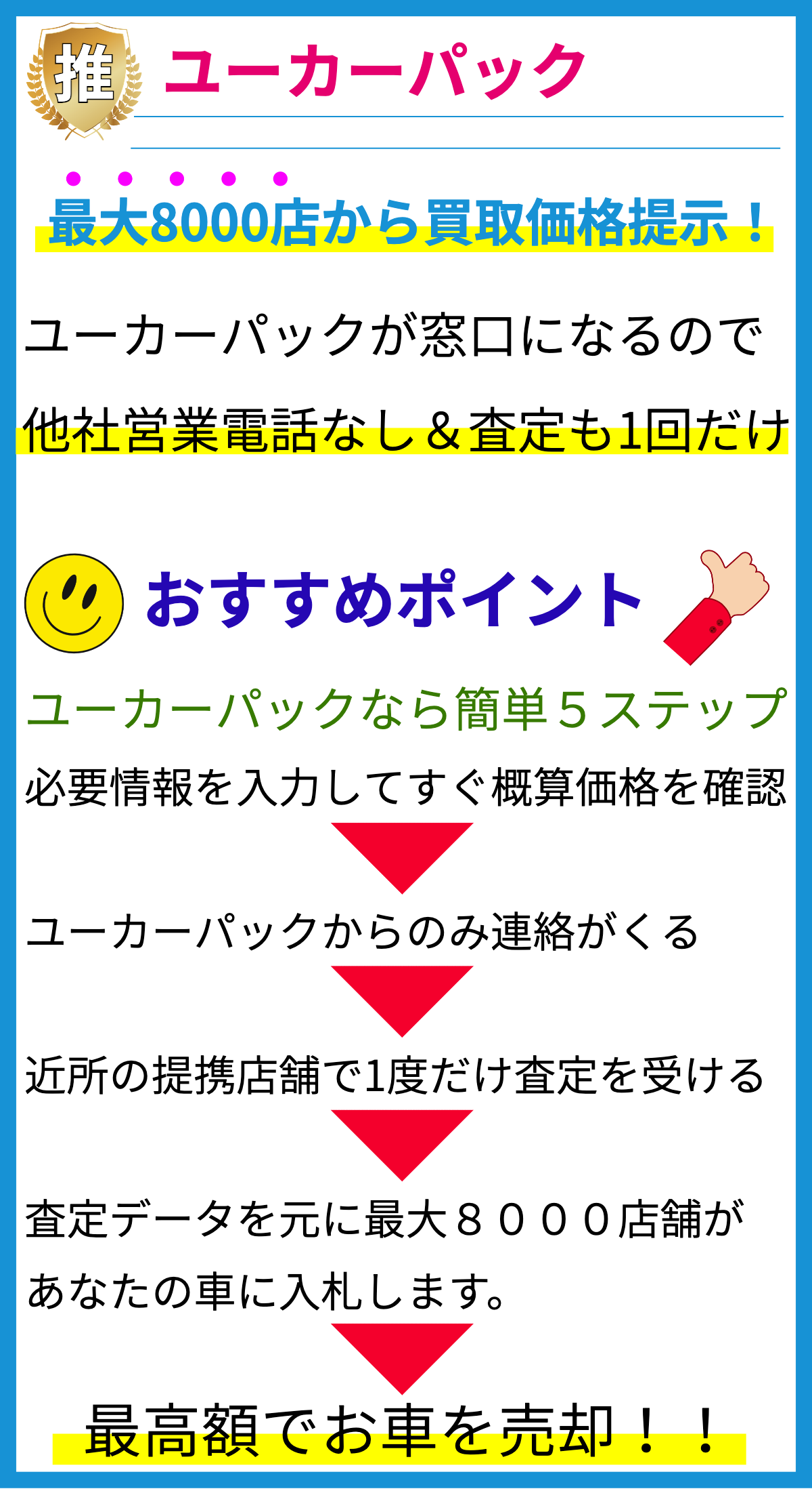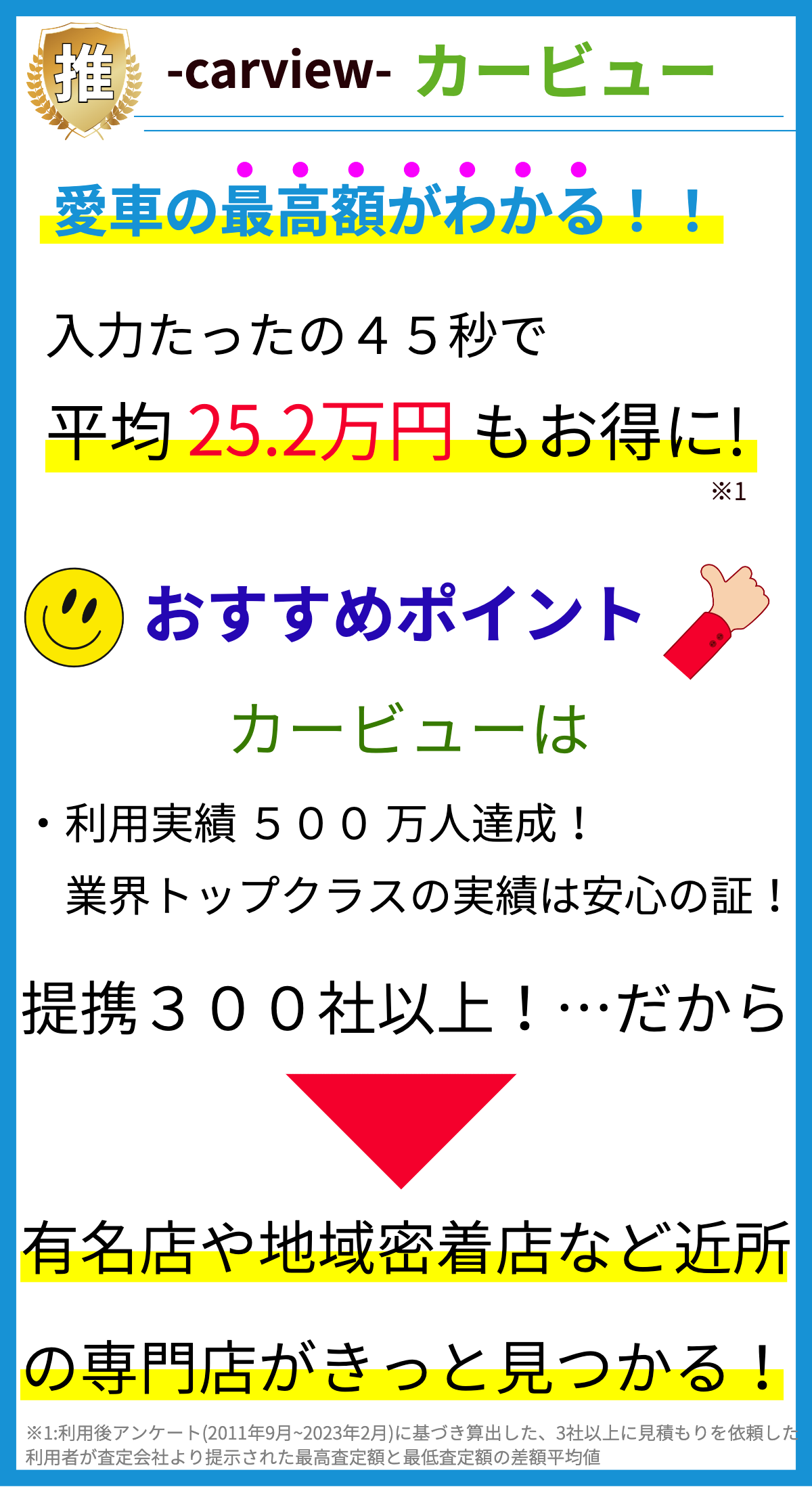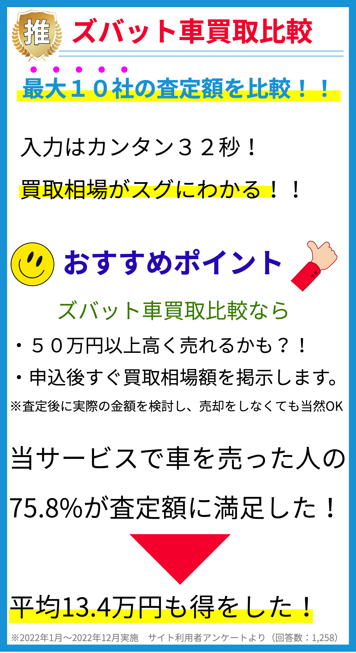 このサービスでは、入力した車両情報をもとに複数の買取業者から査定額を提示してもらえます。これにより、各業者の査定額を簡単に比較することができるため、より高い買取価格を見つけやすくなります。